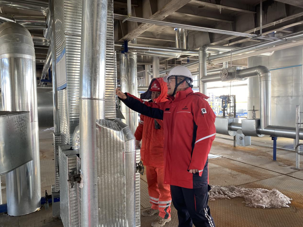 在凝结水站区域,贾东栋认真查看设备的保温层是否完好无损,电伴热带的缠绕是否均匀规范,并详细询问技术人员关于仪表伴热的日常巡检流程。他强调,冬季设备的稳定运行关系到整个生产链条的连续性和安全性,要加强日常巡检力度,增加巡检频次,制定详细的巡检清单,确保不放过任何一个可能存在的隐患点,保障装置的平稳运行。